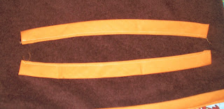 Lastly, measure about 8-9 in of the left over binding and cut 2 pieces. Sew along the open side to make long strips. Turn under each end and sew across. These will become the handles.